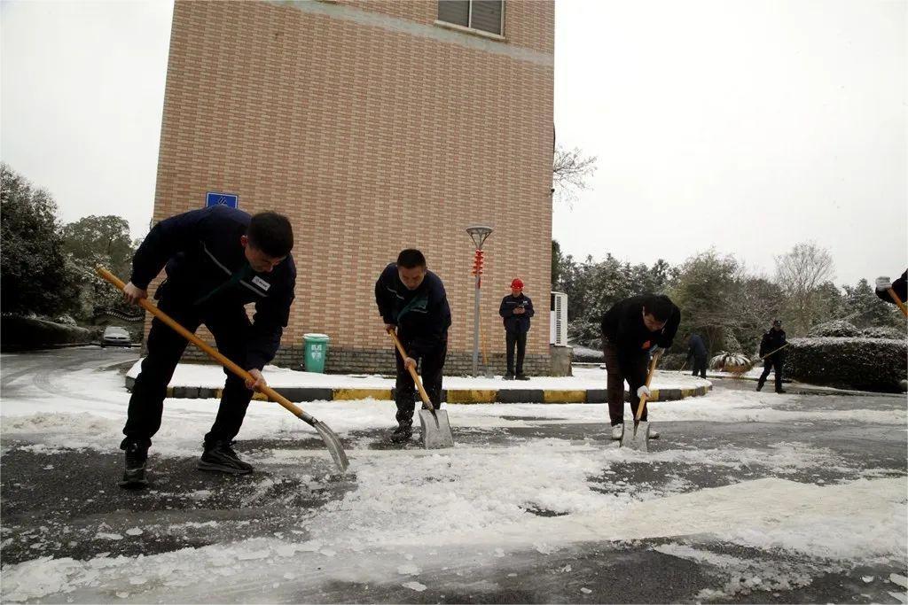 生產(chǎn)管理部組織員工清理辦公樓廣場積雪,確保進出員工、車輛安全通行。