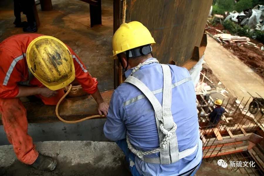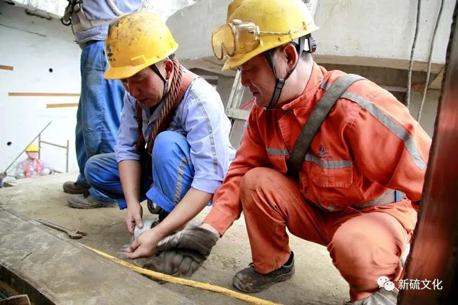 地面上大吊車、大貨車,選礦廠相關(guān)負(fù)責(zé)人、技術(shù)人員、安全員等忙著起吊龐然大物時,“焊高組”在底座上也一刻沒閑著,拖運電焊設(shè)備、準(zhǔn)備焊接材料、在底座上鋪水泥保持平面,各個槽體支腳找平衡......由于底座緊挨著磨浮車間,空氣不流通,加上天氣悶熱難擋,武裝整齊的好“焊”們一會就汗?jié)窳斯ぷ鞣?,汗珠順著安全帽壓著的發(fā)根往下滾。